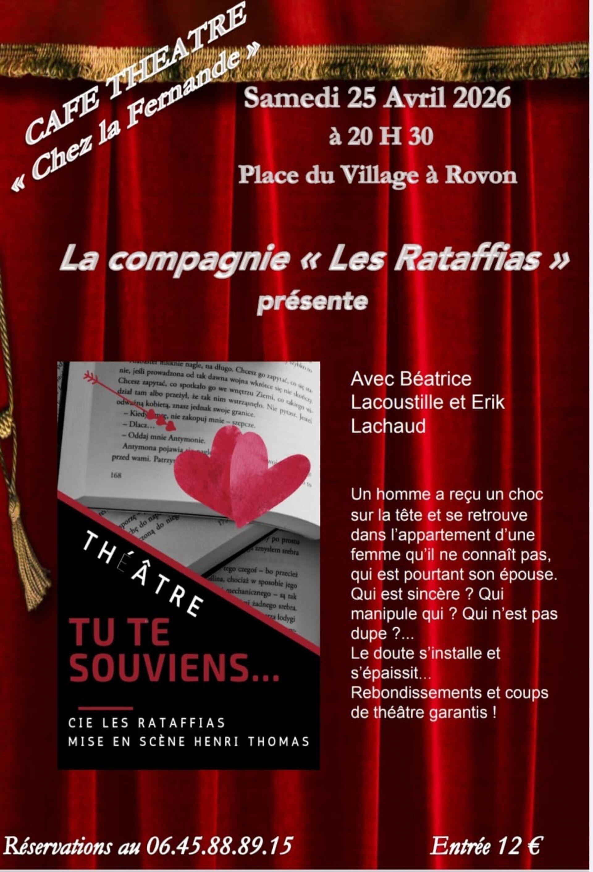 "Tu te souviens..." par la Cie Les Rataffias - un homme a reçu un choc sur la tête et se retrouve dans l'appartement d'une femme qu'il ne connait pas....qui est pourtant son épouse - rebondissements et coups de théâtre garantis !